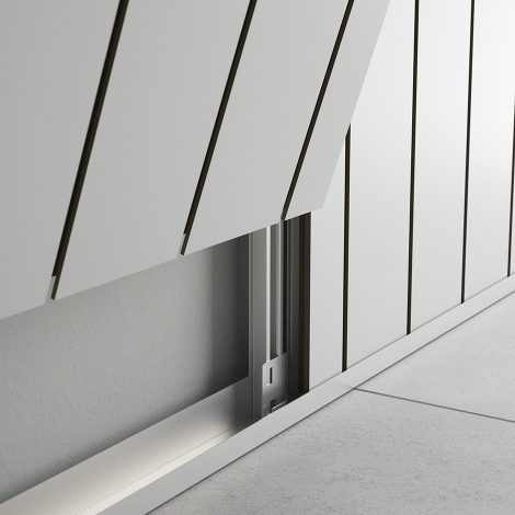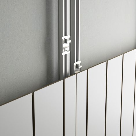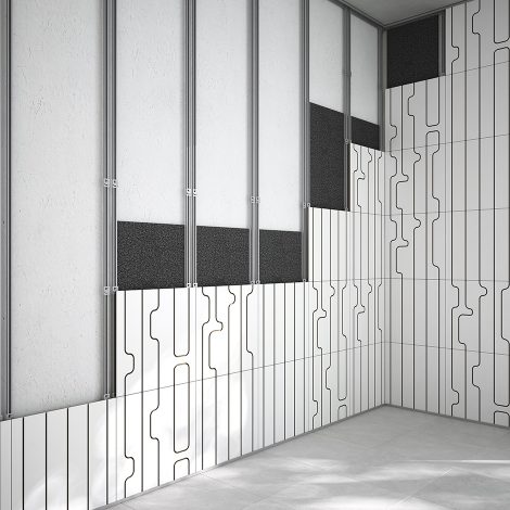 Modular suspended system with high sound absorbency. Panels are installed via steel cables fixed to the ceiling using a selection of easy-to-use hardware. The rear of the panels is covered with a sound-absorbent film in black non-woven fabric.