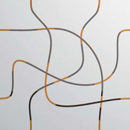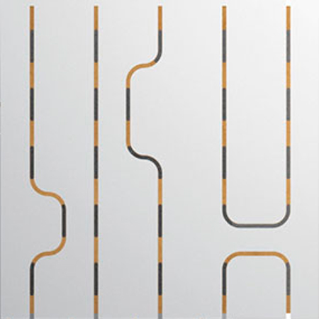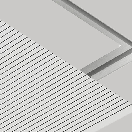 Modular suspended system with high sound absorbency. Panels are installed via steel cables fixed to the ceiling using a selection of easy-to-use hardware. The rear of the panels is covered with a sound-absorbent film in black non-woven fabric.