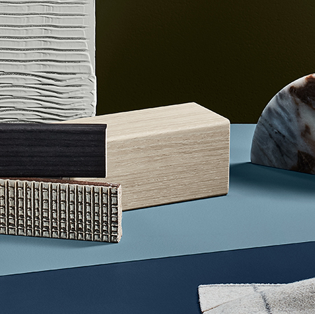 The familial warm whites, brown-based neutrals and dusty blues of the Retreat palette are a reaction to the current instability of the world, offering a sense of familiarity and refuge. This palette includes Eveneer Woodwall Ravenna and Angora, pared with unpredictable material and colour combinations such as burgundy and deep ocean blue.