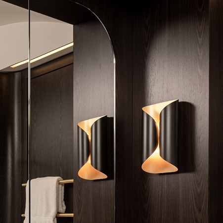 WoodWall in Planked Walnut was selected to wrap around the undulating partitions, providing the required flexibility and bringing richness to the space. As the project progressed, WoodWall was also used across other surfaces. The resulting space cocoons through the series of softly curved spaces wrapped in walnut veneer; dark, rich and moody in contrast to the light, clean line aesthetic commonly adopted in beauty clinics.